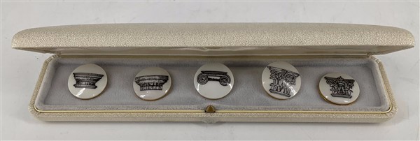 Piero Fornasetti Gruppo di cinque bottoni in porcellana serigrafata in nero con