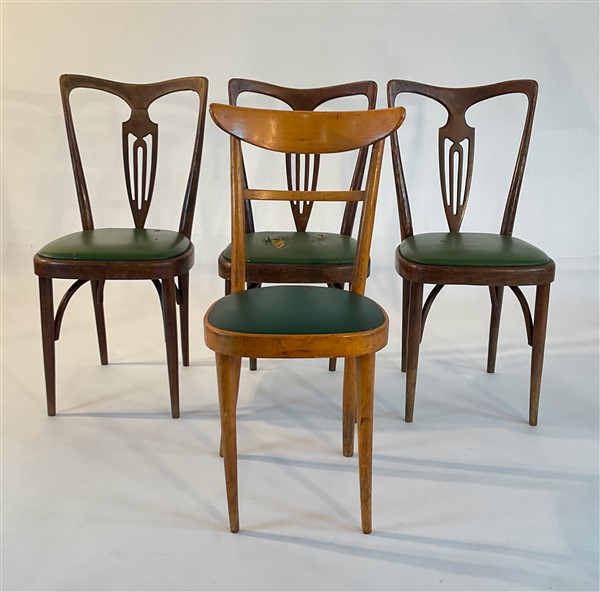 Lotto composto da tre sedie in legno con schienale intagliato a lira e seduta in simil pelle. Unite ad una di diversa manifattura in faggio chiaro. Italia, anni '40/'50. (cm max 45x92x45) (difetti)