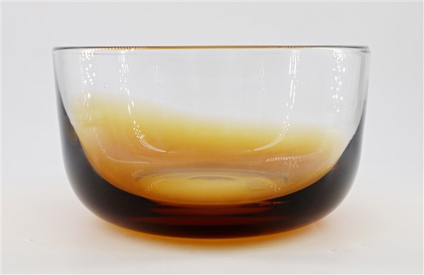 Coppa in vetro trasparente incolore sfumato ambrato. Anni '70. (h cm 10; d cm 20) (difetti)