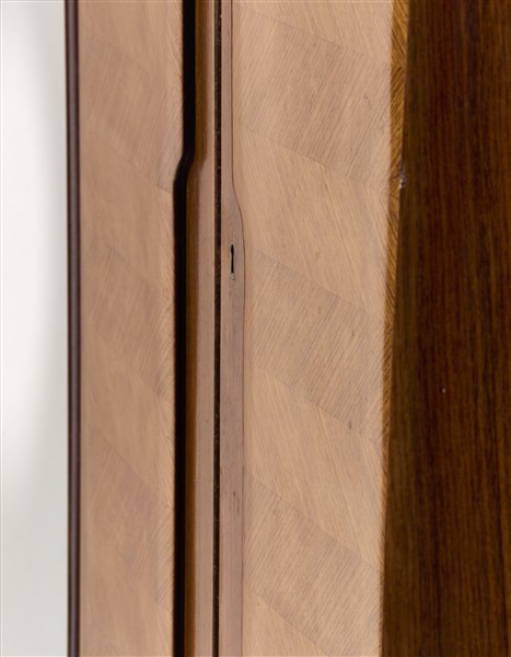 Armadio a sei ante di cui quelle centrali a specchio. Cantù, 1950ca. Legno massello e impiallacciato. Pannelli impiallacciati a spina di pesce.