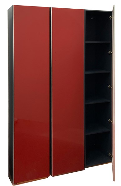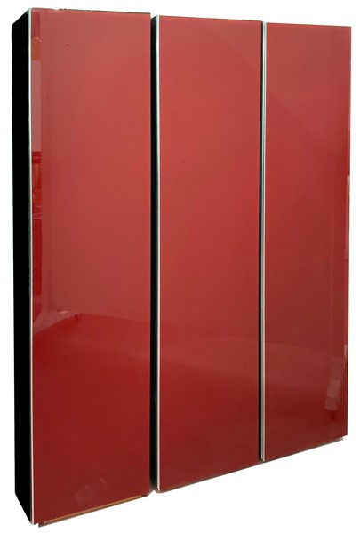 Tre mobili contenitore con ripiani interni e sportelli pensili in vetro retroverniciato rosso con fasce perimetrali in metallo. Italia, anni 2000. (cm 40x195x41) (lievi difetti)