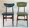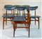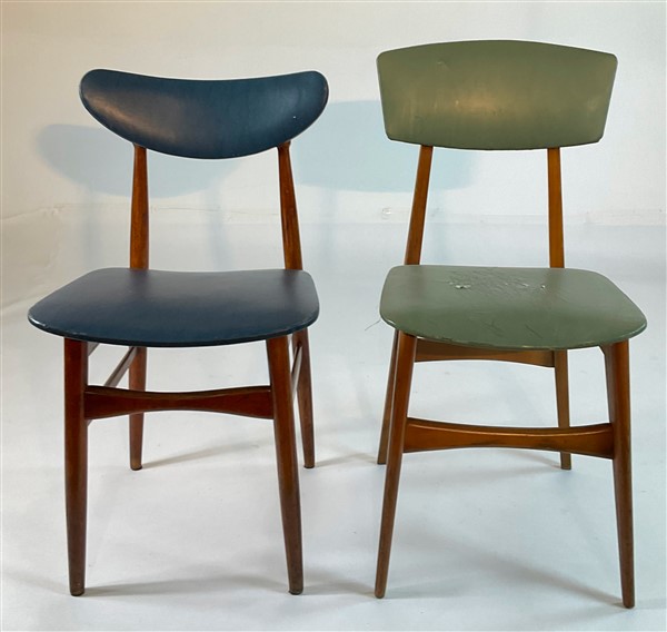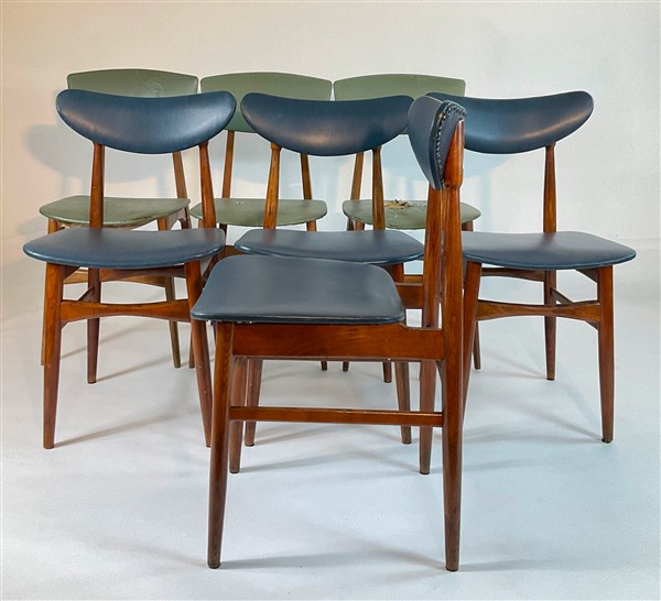 Lotto composto da un gruppo di quattro sedie in legno con rivestimento in skai blu e tre in legno con rivestimento in skai sabbia. Italia, anni '60. (cm 40x86x49) (difetti)