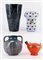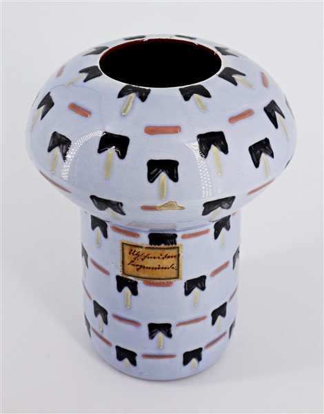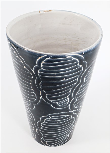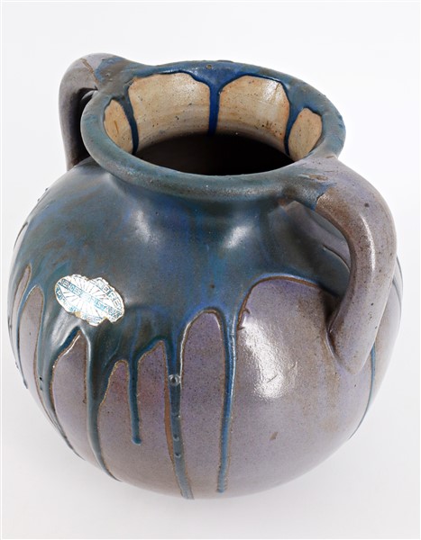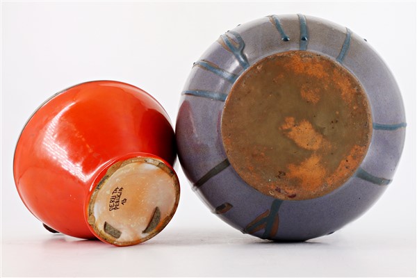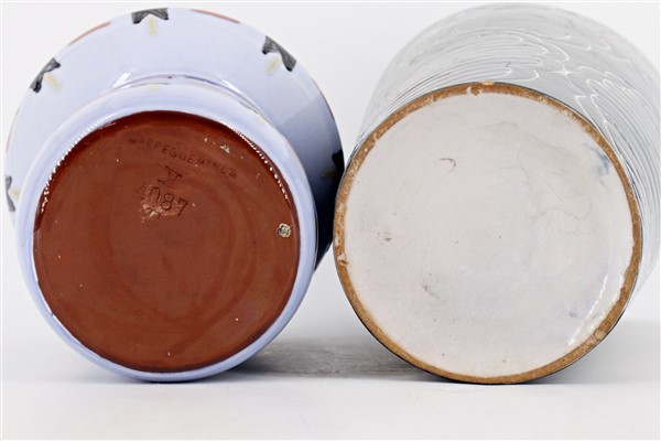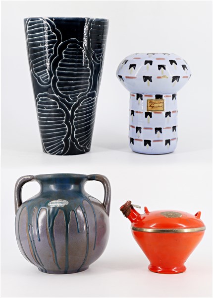Lotto composto da un vaso della Manifattura Sarreguemines, una fiasca marcata Deruta, un vaso in ceramica smaltata a forme geometriche bianche e nere, ed un vaso biansato di manifattura francese in terracotta a colaggio nei toni del blu e grigio. Secolo XX. (h max cm 25) (difetti)