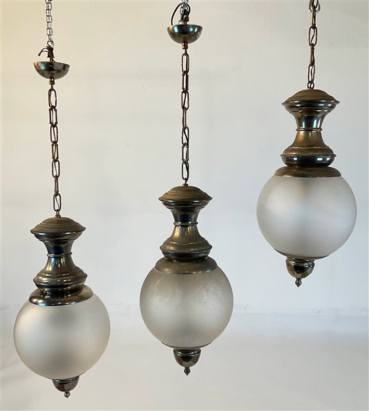 Tre lampade a sospensione. Italia, anni '50/'60. Diffusore sferico in vetro satinato e struttura in metallo. (d cm 20) (difetti)