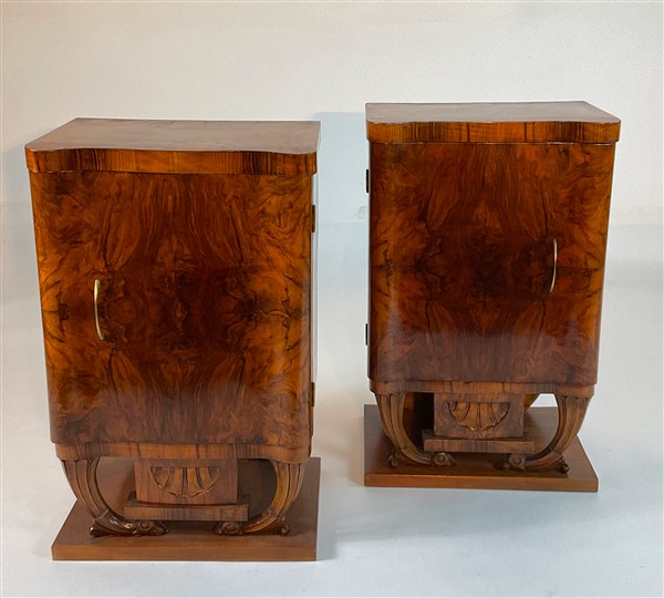 Coppia di comodini déco impiallaciati in radica di noce. Italia, anni '30. (cm 46x74x34) (difetti e restauri)