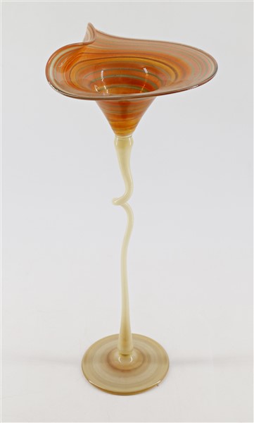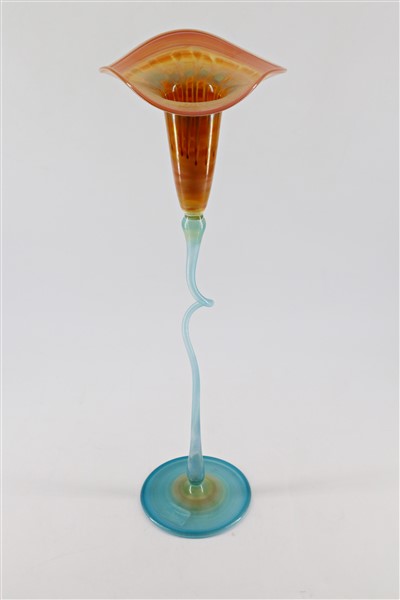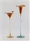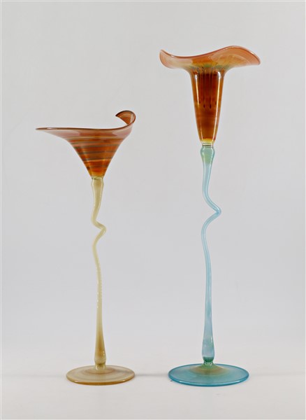 Lotto di due vasi a stelo in vetro policromo. Austria, anni '80/'90. Firmati e numerati a punta sotto la base. (h cm 34) (lievi difetti)