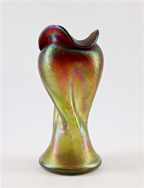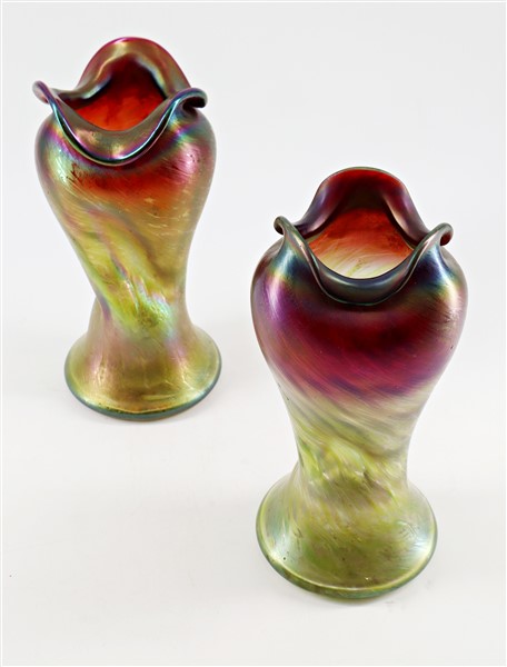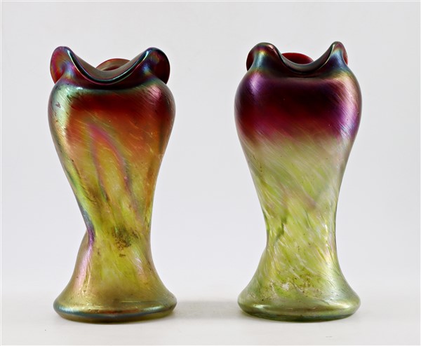 Loetz (Attribuito) Coppia di vasi fitomorfi. Austria, inizio secolo XX. Vetro so