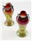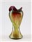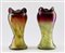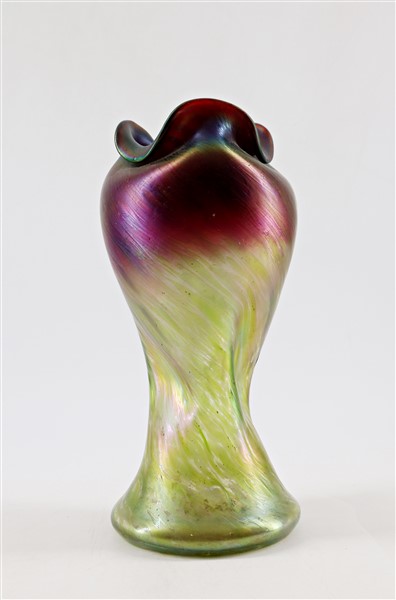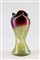 Coppia di vasi fitomorfi. Austria, inizio secolo XX. Vetro soffiato nei toni del verde e dell'ametista a striature superficiali a rilievo e fortemente iridate. (h cm 18)