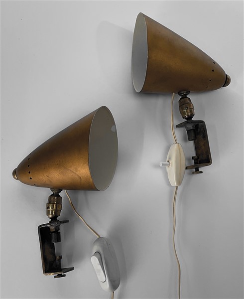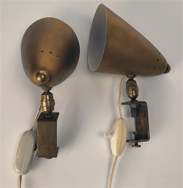 Coppia di lampade da tavolo a morsetto. Italia, anni '40/'50. Base in ottone e
