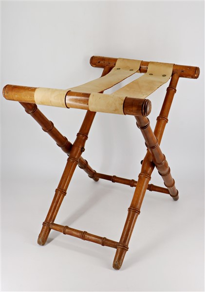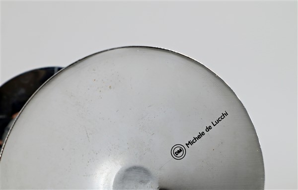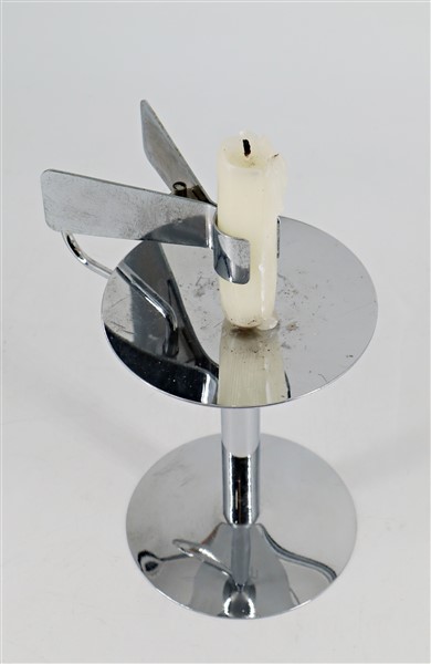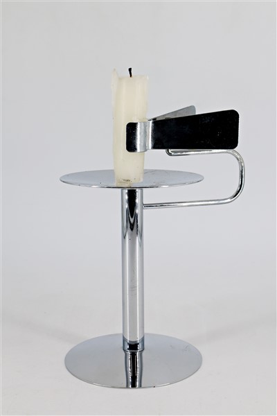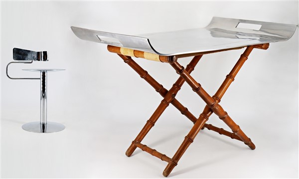 Lotto composto da un vassoio in alluminio retto da un trespolo pieghevole in legno simulante il bambù e con cinghie in cuoio, unito a un porta candela di Michele De Lucchi. (vassoio cm 71x45) (difetti)