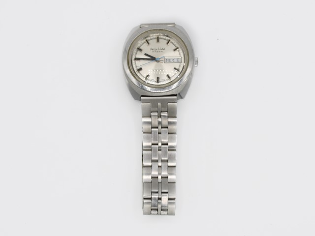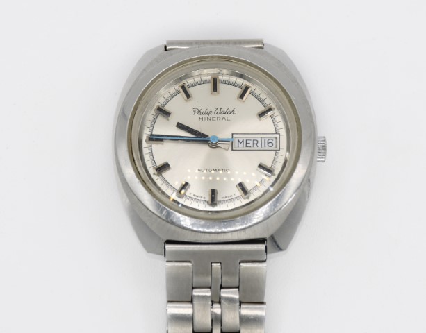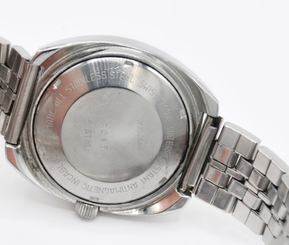 cassa in acciaio con fondo a vite, bracciale in acciaio originale con logo nella chiusura, vetro minerale piatto, movimento automatico calibro Eta 2789, referenza cassa 4045