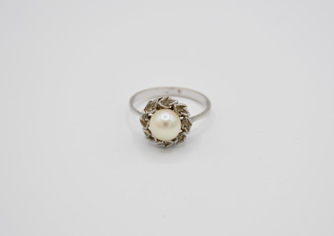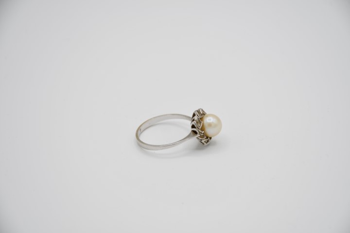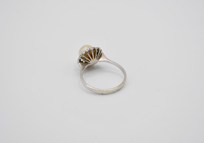 Anello in oro bianco e perla coltivata e imitazione di diamante
