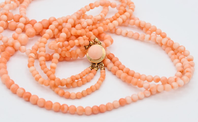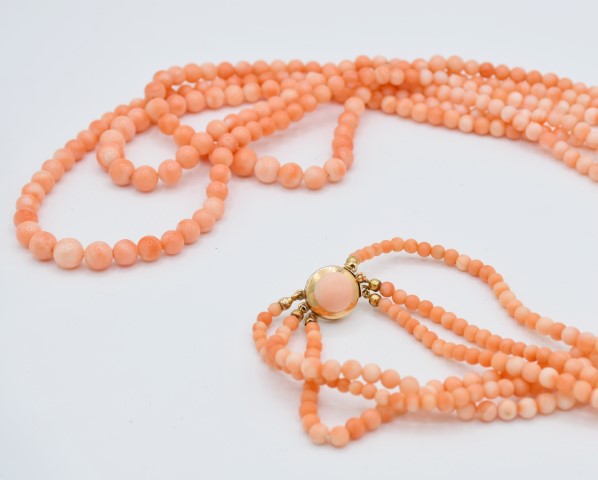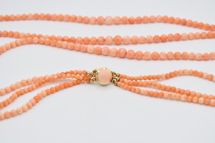 Collana in corallo rosa a 3 fili a scalare