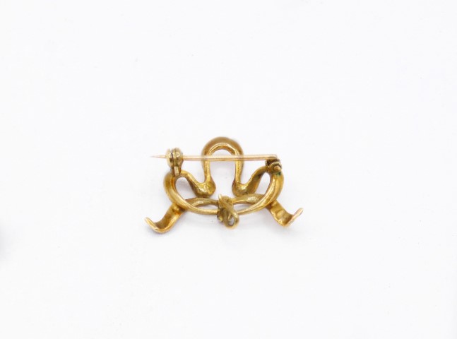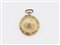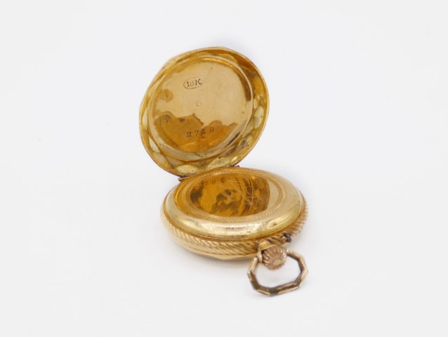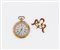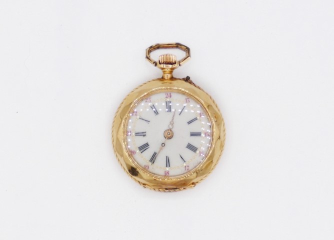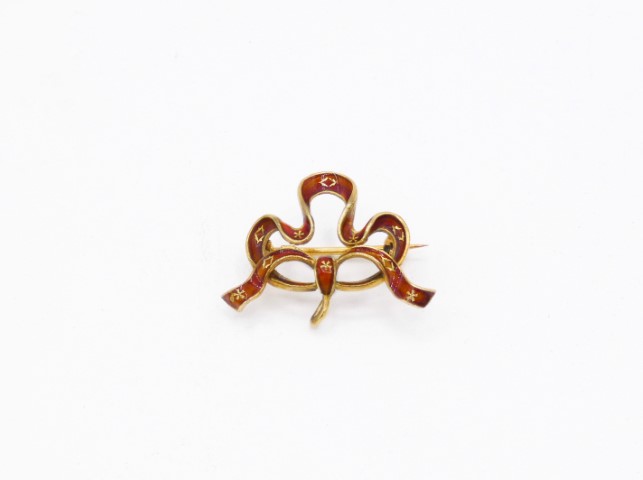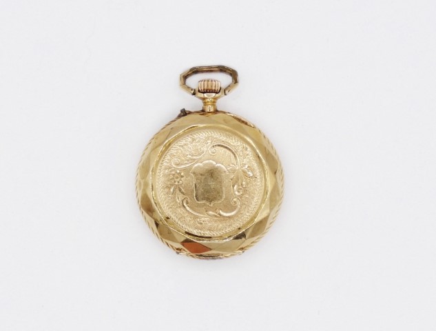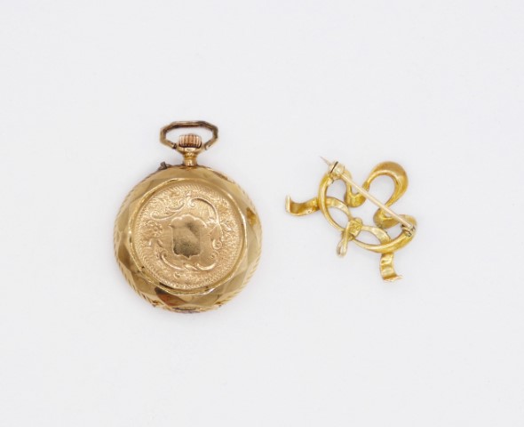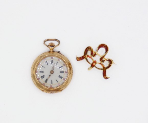composto da un orologio da tasca con cassa in oro 18kt, e una spilla a fiocco smaltato in oro 750