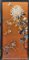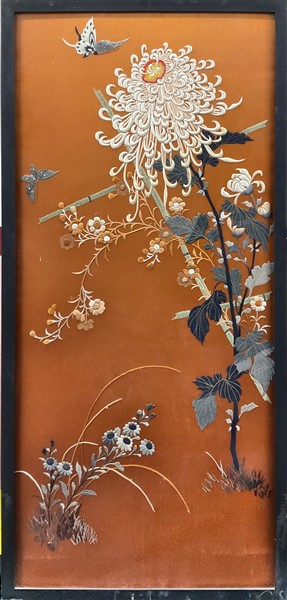 Ricamo in seta a punto lanciato su fondo di raso color mattone. Decoro raffigurante un grande fiore di crisantemo con bambù, rami fioriti e farfalle. In cornice sottovetro (cm max 137x67) (lievi difetti)