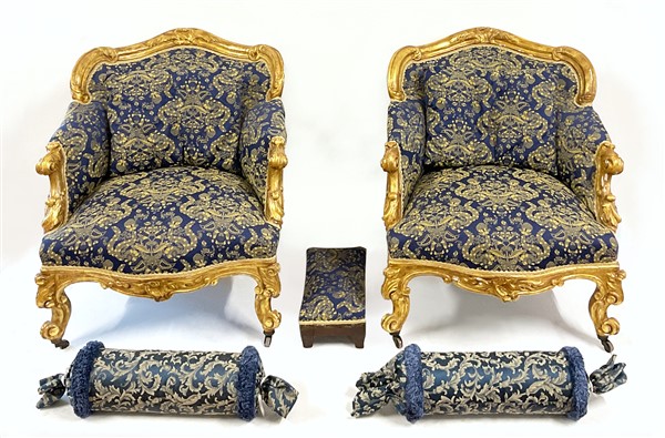 Coppia di antiche poltrone in legno intagliato e dorato con decoro a volute fogliate, piedi muniti di rotelle, con cuscini; unite ad un poggiapiedi diverso (difetti)