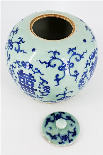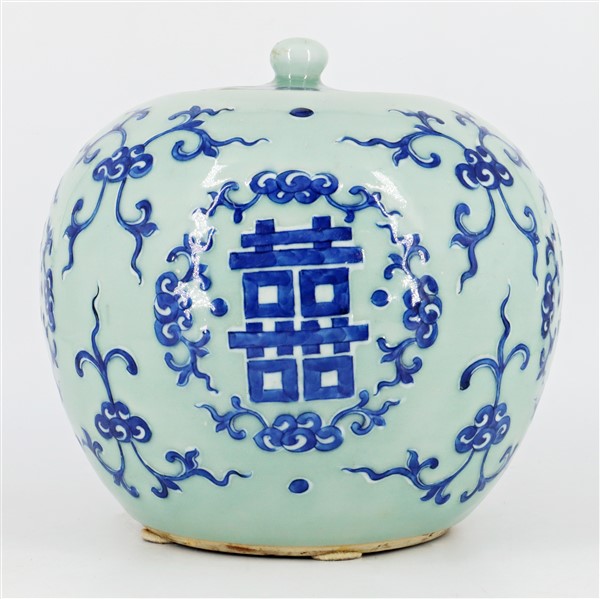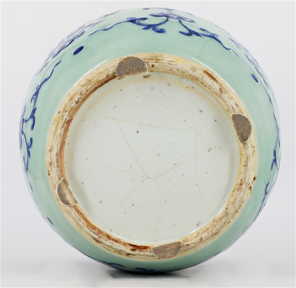 Potiche con coperchio in porcellana a fondo celadon con decori in blu Cina, sec