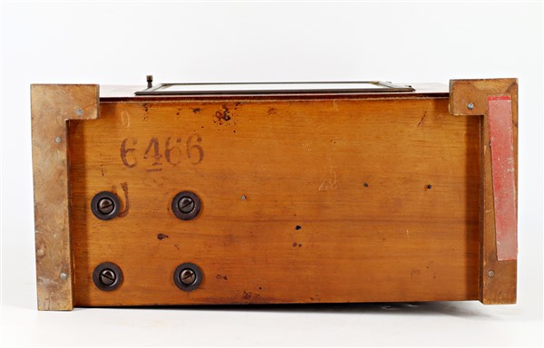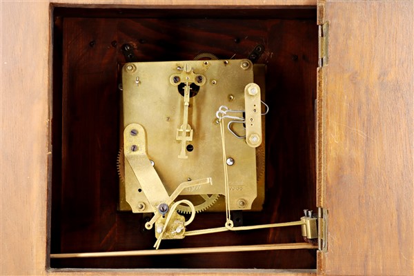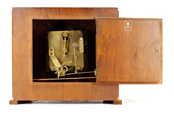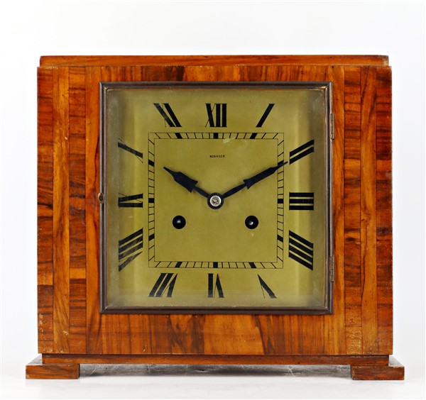 Kienzle. Pendoletta da scrivania con cassa lastronata. Quadrante in metallo a cifre romane, movimento con suoneria delle ore su due gong. Anni '20 (cm 29x25x14) (difetti)