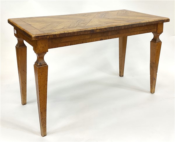 Tavolino da salotto di forma rettangolare impiallacciato e filettato in noce, gambe a obelisco rovesciato (cm 78x45x38) (difetti)