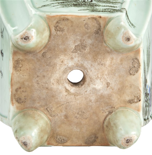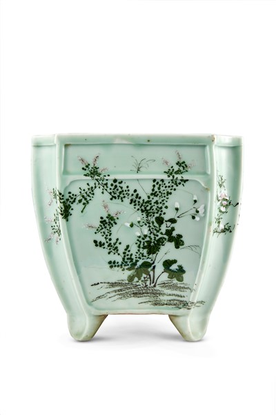 Cachepot in porcellana a fondo Celadon decorato con rami fioriti e volatili a r