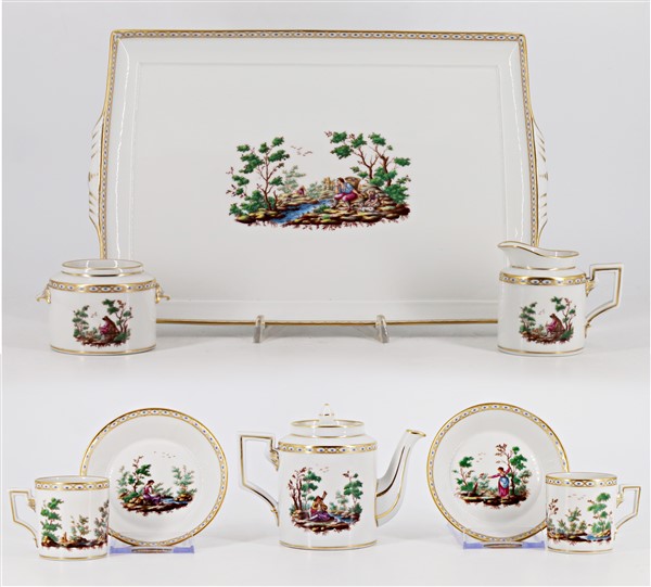 Manifattura Richard-Ginori, secolo XX. Servizio tête-à-tête in porcellana policroma decorata a paesetti e figure con profili in oro composto da vassoio, lattiera, zuccheriera, teiera e due tazze con piattino. Un coperchio mancante (cm max 34x23) (difetti)