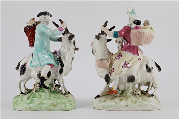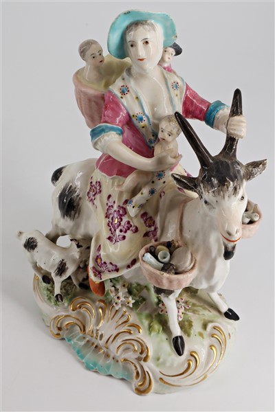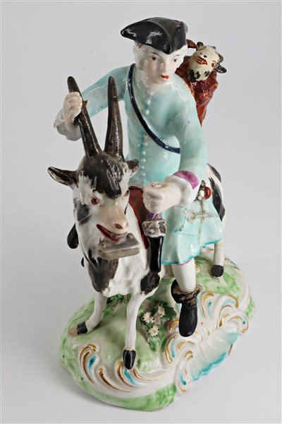 Manifattura del secolo XIX. Coppia di figure di ambulanti su capra in porcellana dipinta in policromia e profili in oro (h. cm 17) (difetti e restauri)