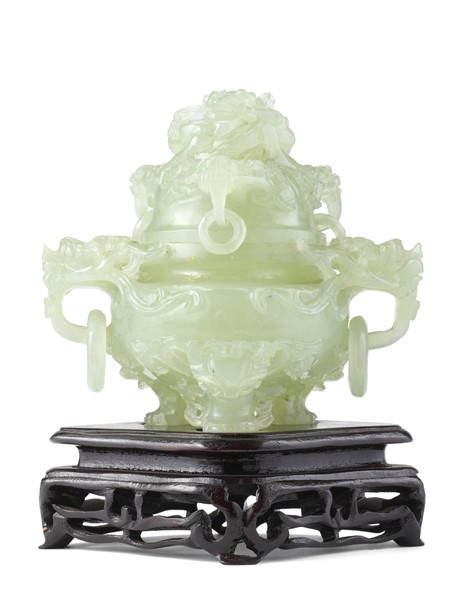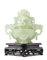 Vaso con coperchio in serpetino la presa e le anse decorate con draghi scolpiti, poggiante su base in legno intagliato