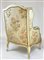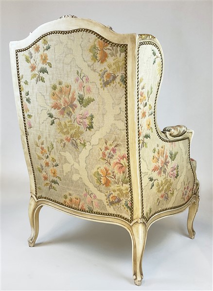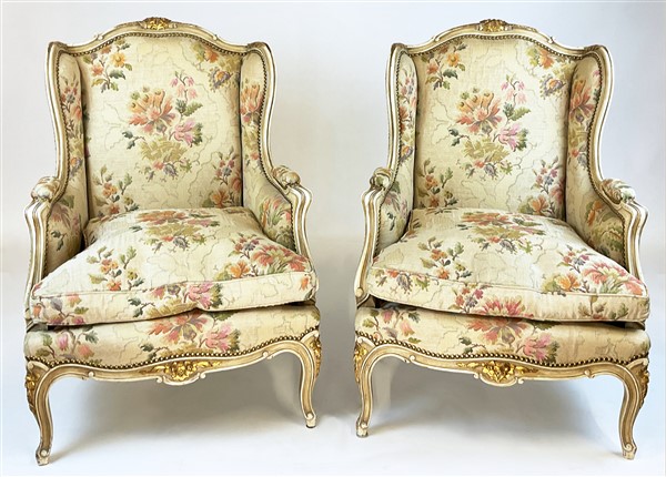 Coppia di poltrone a orecchioni in legno intagliato, laccato e dorato, rivestim