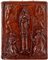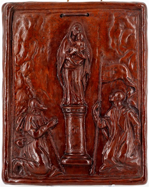 Manifattura del secolo XIX. Placca in terracotta smaltata con decoro a rilievo raffigurante la Vergine con Bambino e santi (cm 28x22) (difetti)