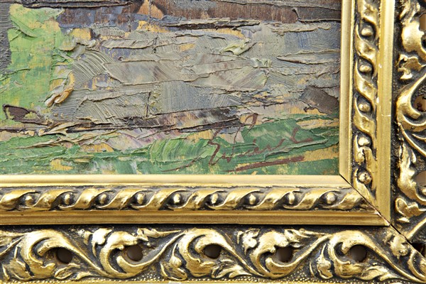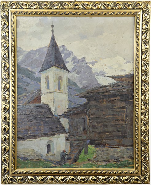 Firma indecifrata, secolo XX "Scorcio montano con campanile e baita" olio su
