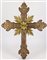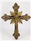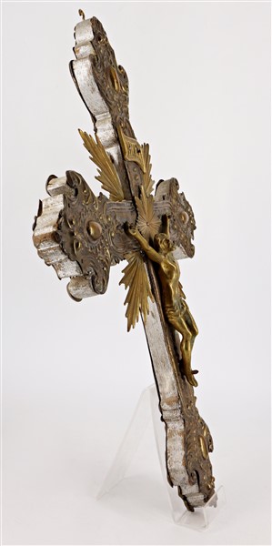 Arte del secolo XIX. Croce astile in metallo sbalzato, argentato e dorato su supporto ligneo (cm 56x46) (difetti)
