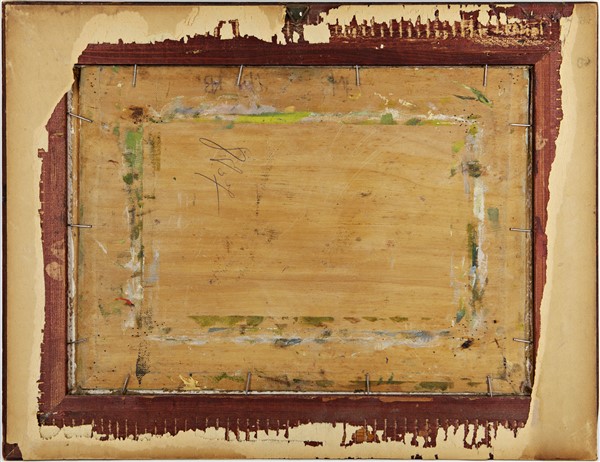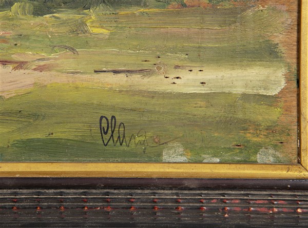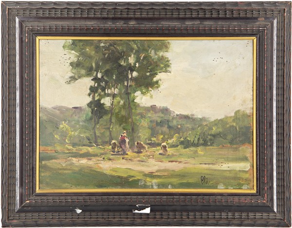 Firma indecifrata, secolo XX "Paesaggio con contadina e gregge" olio su compe