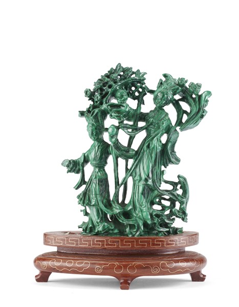 Gruppo di figure orientali in malachite, su base in legno (cm 13x16) (difetti e rotture)