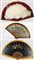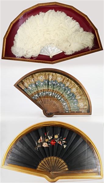 Lotto composto da tre diversi ventagli, secolo XIX-XX. Uno con strecche in madreperla e piume, uno con stecche in legno e pagina in tessuto ricamato e uno con stecche in legno e pagina in seta dipinta a fiori. Entro teche (cm max totale 86x52) (difetti)