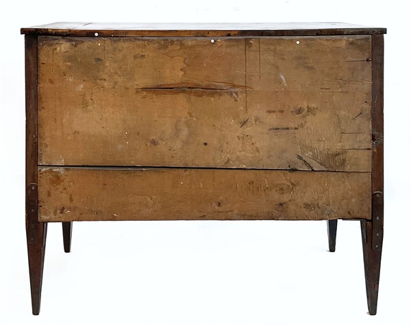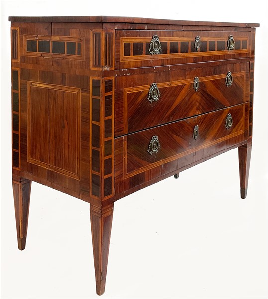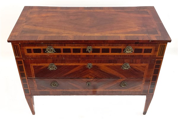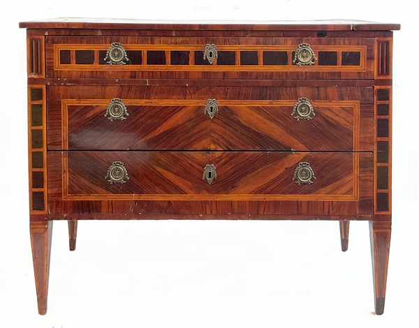 Cassettone lastronato in palissandro e filettato in legni vari, fronte a tre cassetti di cui uno a mezza altezza sottopiano, gambe ad obelisco rovesciato. Fine secolo XVIII (cm 116x93x50) (difetti)