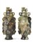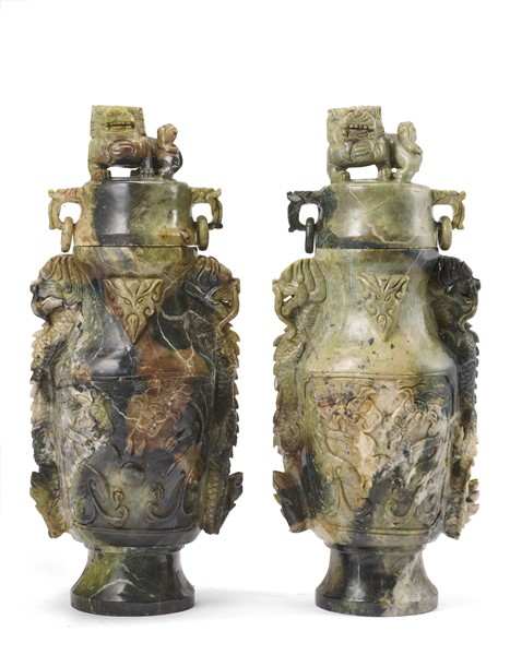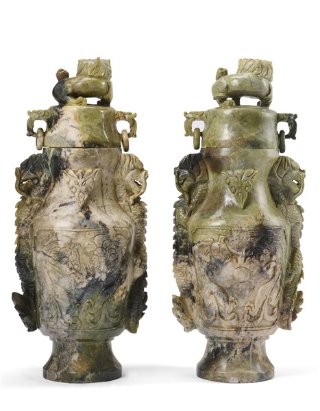 Lotto composto da due vasi in pietra saponaria con coperchi, decorati con draghi e prese a forma di elefanti