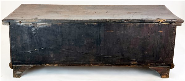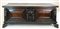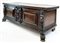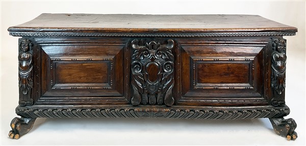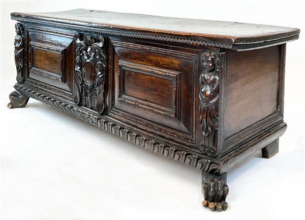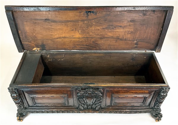 Cassapanca in noce intagliato e scolpito con coperchio a profilo dentellato, sul fronte stemma tra due cartelle, lesene a polena, piedi leonini. Secolo XVII (cm 162x57x57) (difetti e mancanze)