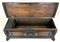 Cassapanca in noce intagliato e scolpito con coperchio a profilo dentellato, su