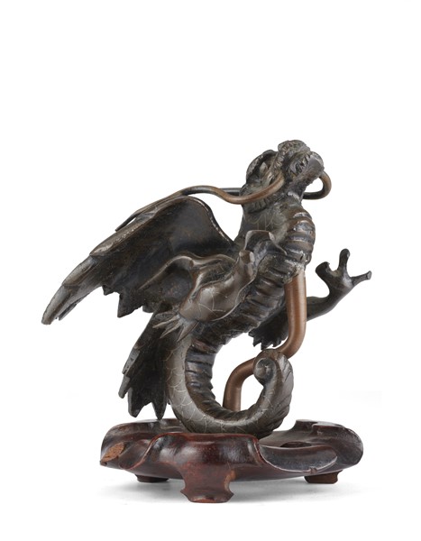 Lotto 1028 | Drago in bronzo montato su base in legno intagliato Cina, secolo XIX/XX (h cm