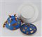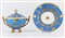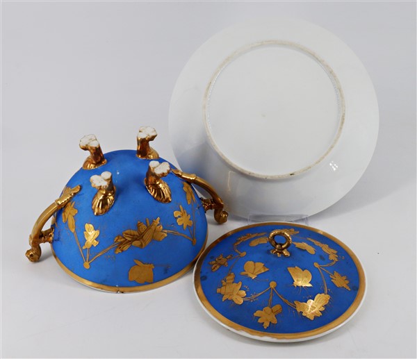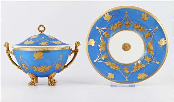 Manifattura del secolo XIX. Tazza da puerpera biansata con coperchio e piatto in porcellana decorata a festoni e farfalle in oro su fondo blu (d max cm 21) (difetti e restauri)
