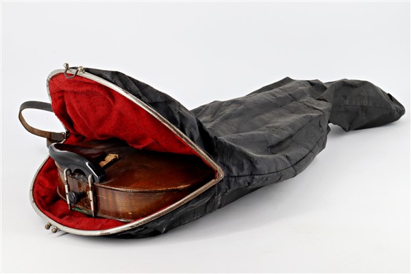 Fondo in due pezzi con leggera marezzatura discendente dalla giunta, vernice di colore marrone dorato, etichetta manoscritta «A. Mezzadri / Viareggio 1934 XII» in discrete condizioni (lunghezza del fondo mm 360). Con una custodia morbida