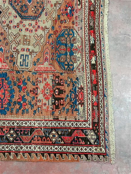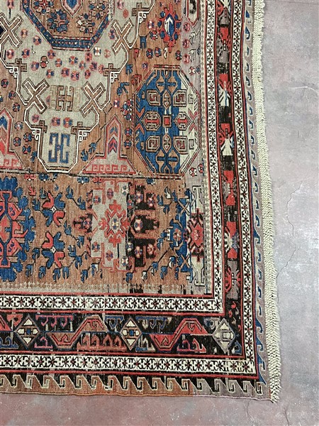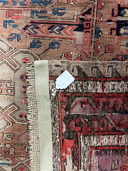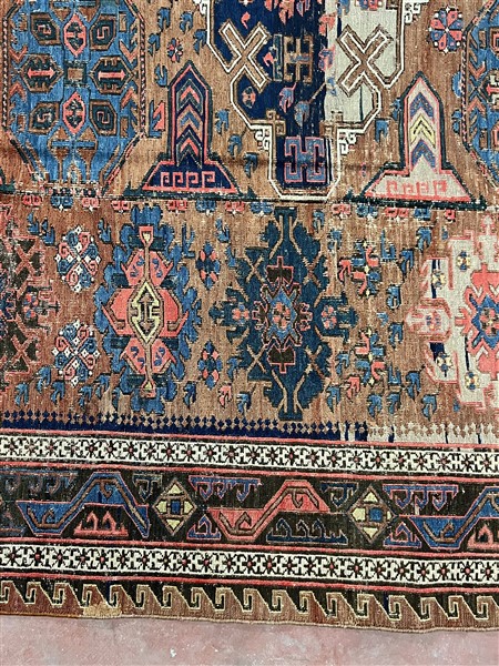 Tappeto Soumak, Caucaso, fine secolo XIX. Decoro con quattro medaglioni romboidali su fondo mattone, mancanze ad una testata (cm 321x254) (difetti e rapature)
