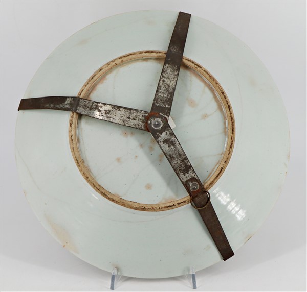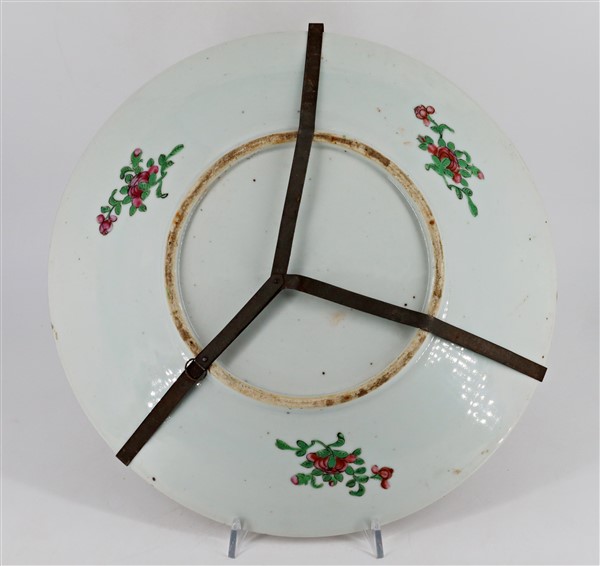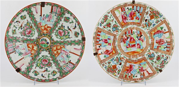 Due piatti in porcellana Canton decorati con motivi floreali e personaggi entro