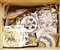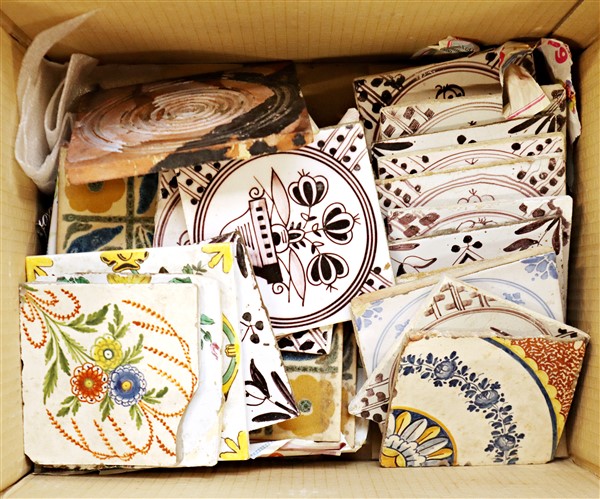 Manifatture diverse, secolo XIX-XX. Lotto composto da numerose piastrelle da parete in ceramica decorata in policromia, in un cartone. (difetti e rotture)