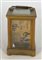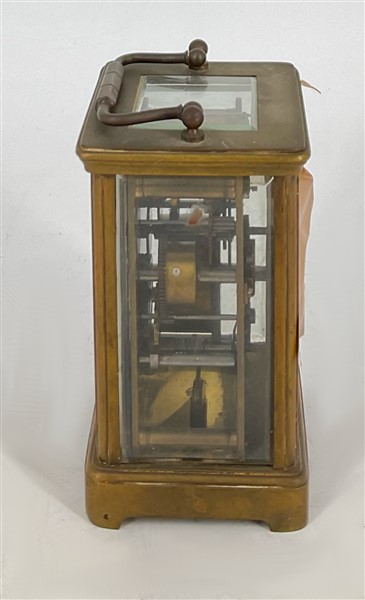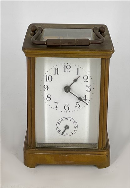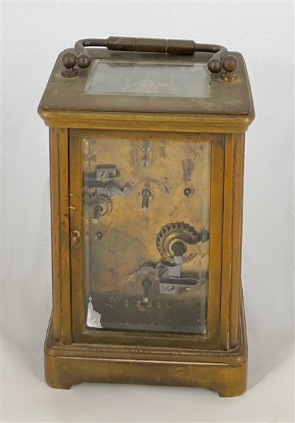 Officier in ottone e vetri. Quadrante a numeri arabi con sveglia (cm 8x6,5x12) (difetti)