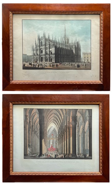 Coppia di acqueforti colorate raffiguranti il "Duomo di Milano" e "L'interno del Duomo di Milano"