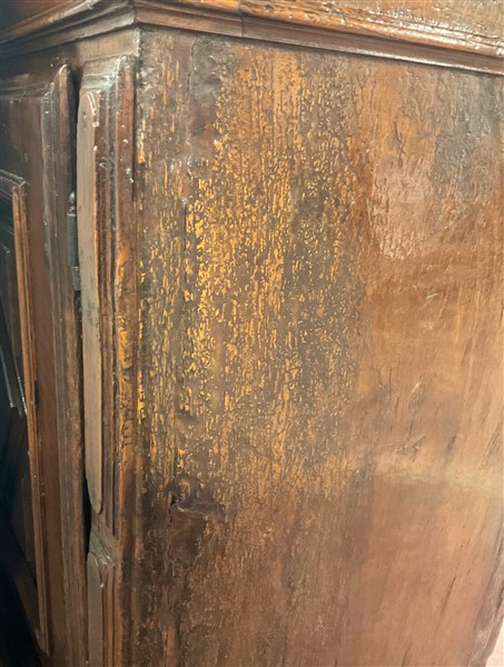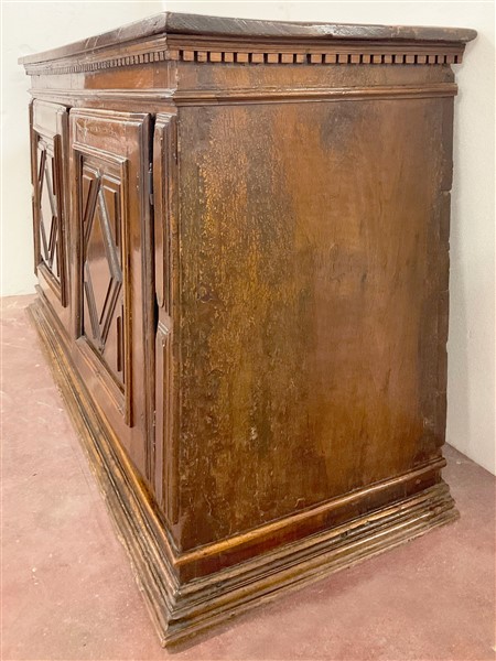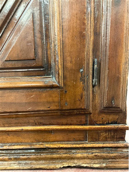 Antica credenza in noce a due ante pannellate e riquadrate, dentellatura sottop