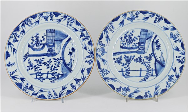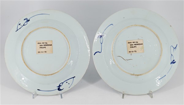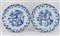 Lotto composto da due piatti in porcellana bianca e blu decorati a motivi floreali