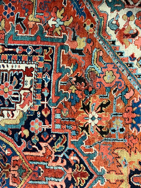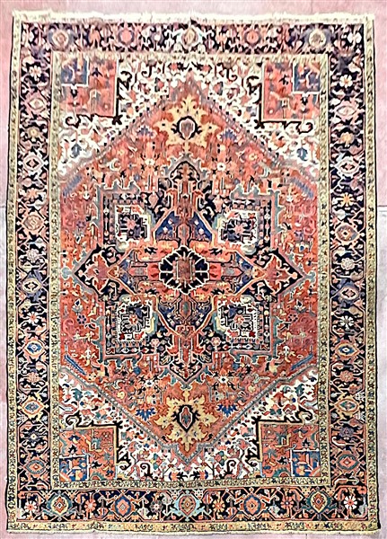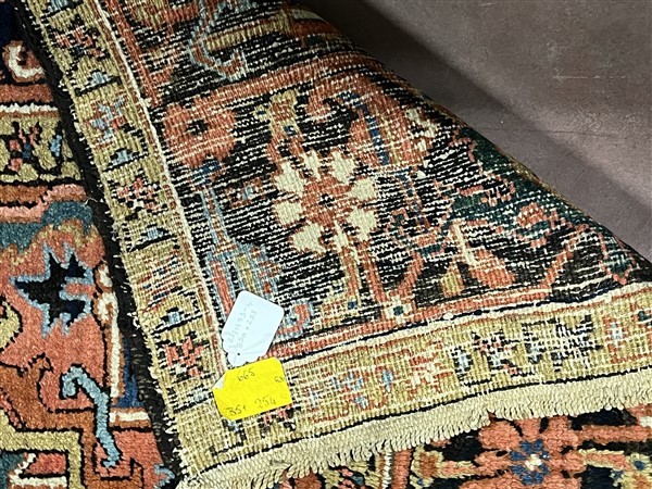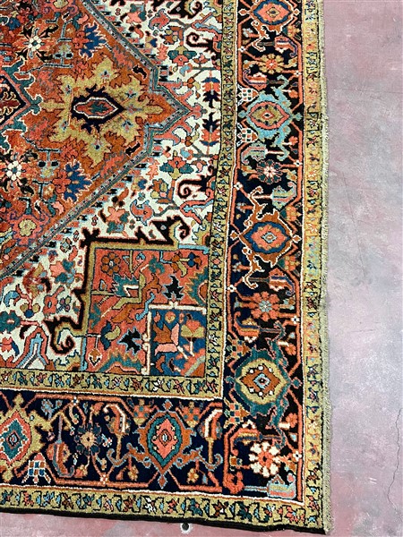 Tappeto Heritz, Persia, inizio secolo XX. Decoro con grande medaglione con puntali su campo rosso mattone, bordura a testuggine su fondo blu notte (cm 350x253) (difetti e rapature)