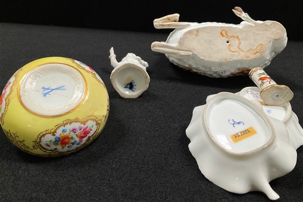 Manifatture differenti, secolo XIX-XX. Lotto composto da due figurette, una scatola con coperchio, due ciotole in forma di foglia ed un segnaposto in porcellana dipinta in policromia, decori differenti (largh. max cm 15) (difetti e restauri)